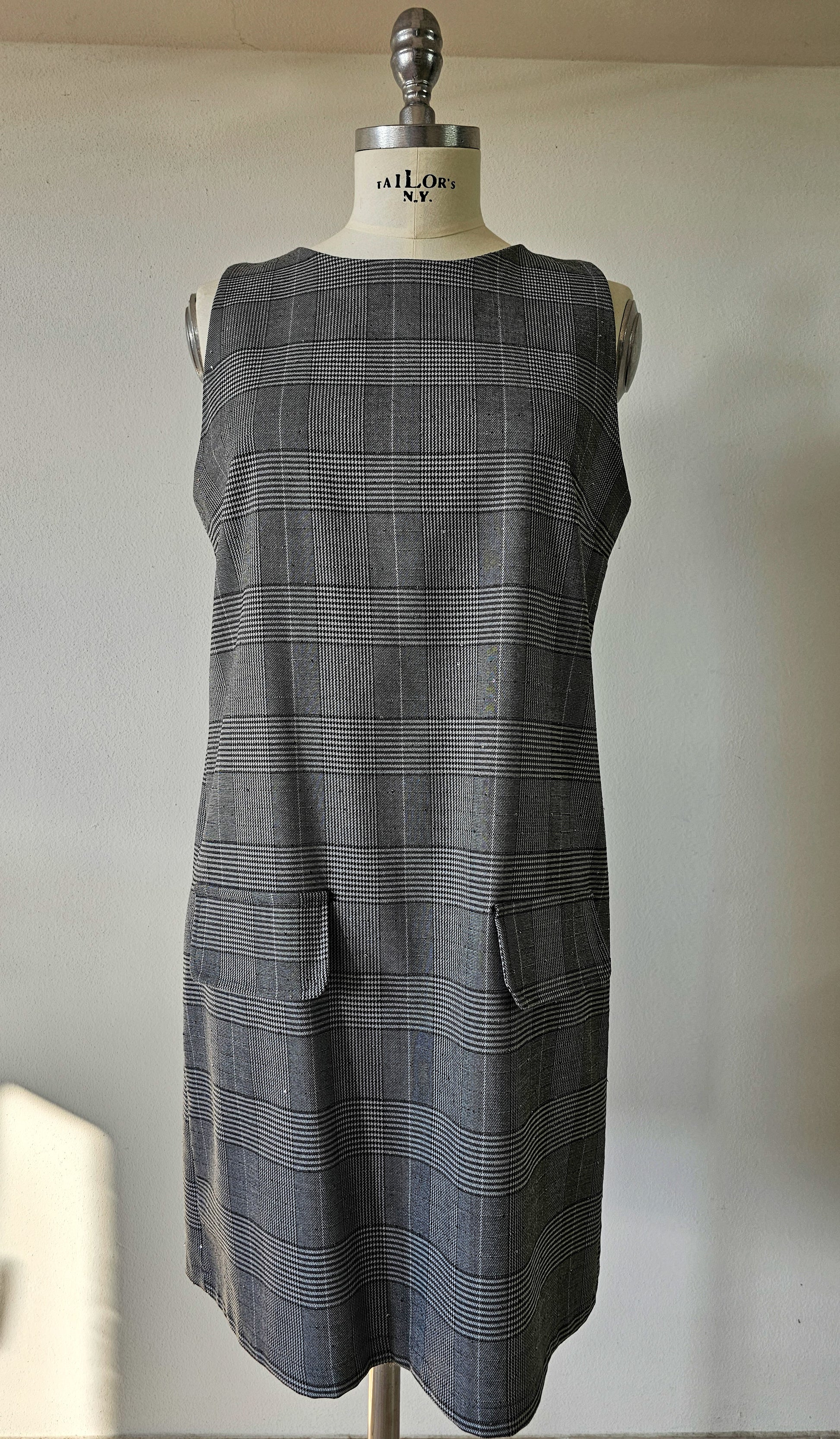 Abito in tessuto principe di Galles con micro paillettes integrate che donano luminosità discreta. Linea ad A ispirata agli anni ’70, con scollo rotondo e tasche applicate sul davanti. Un modello essenziale e versatile, ideale da indossare con camicie o dolcevita per un look contemporaneo e raffinato.