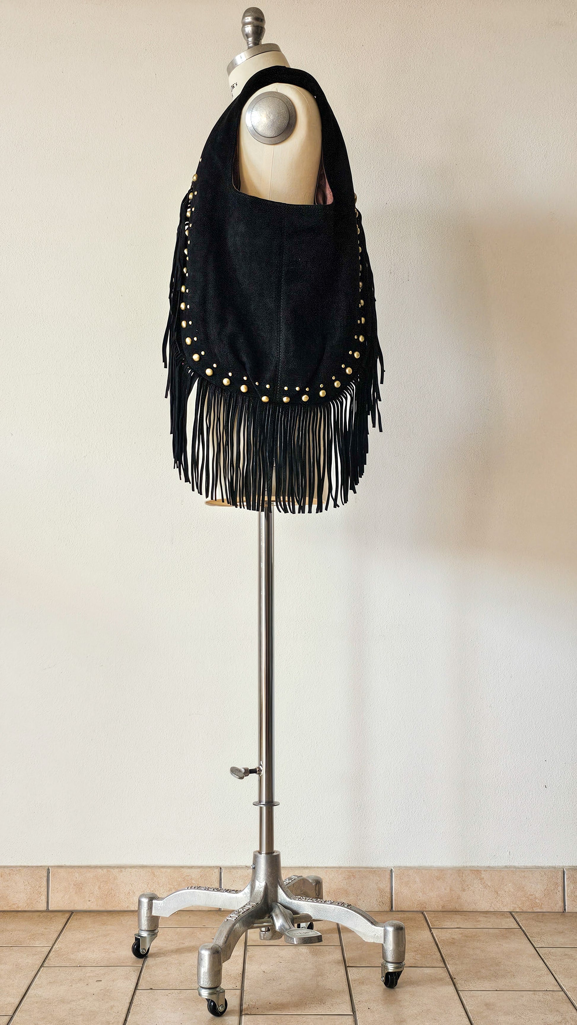 Borsa boho in pelle scamosciata nera, con frange e borchie dorate applicate sul profilo. Accessorio d’impatto che unisce carattere rock e dettagli luminosi.
