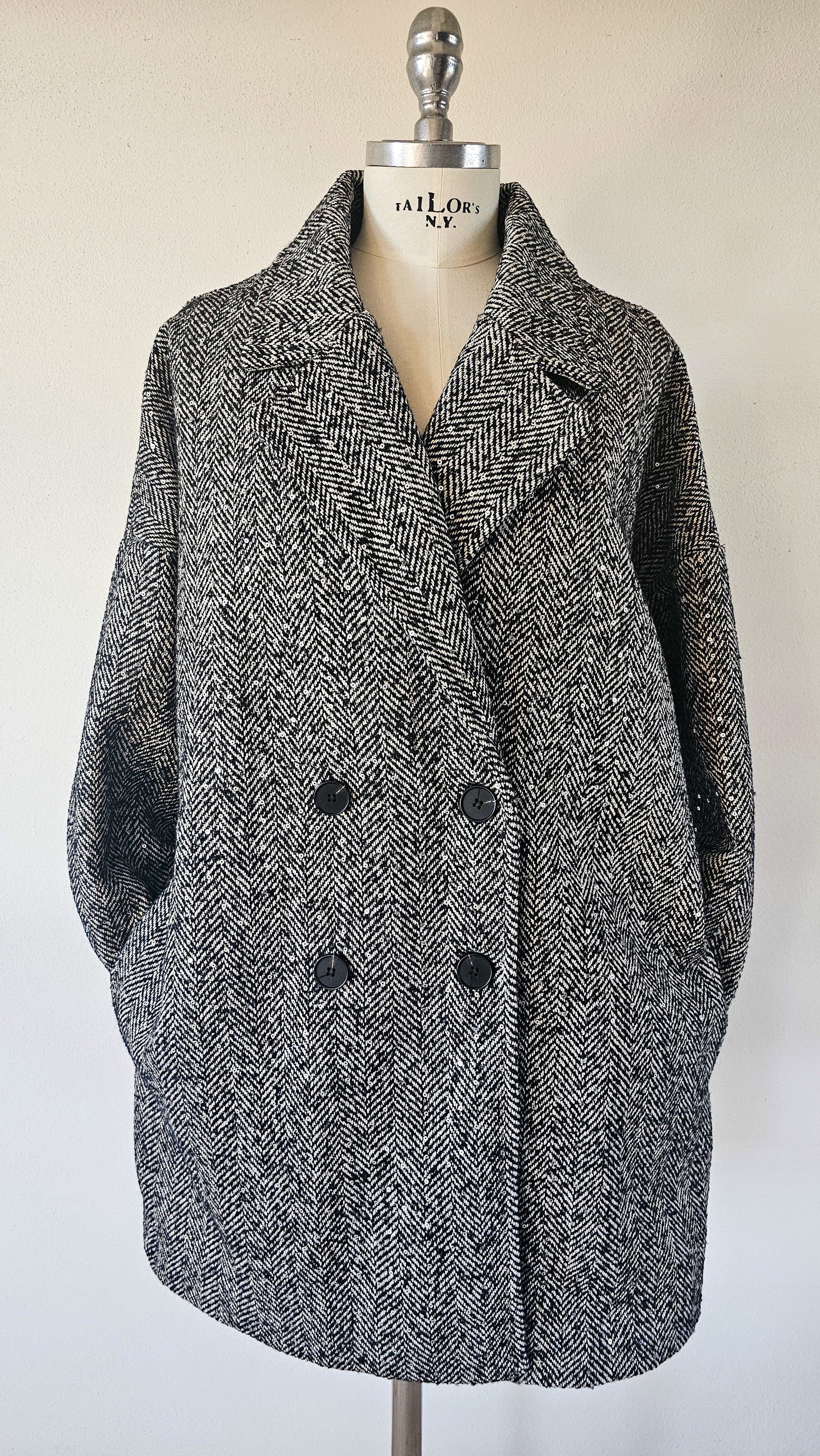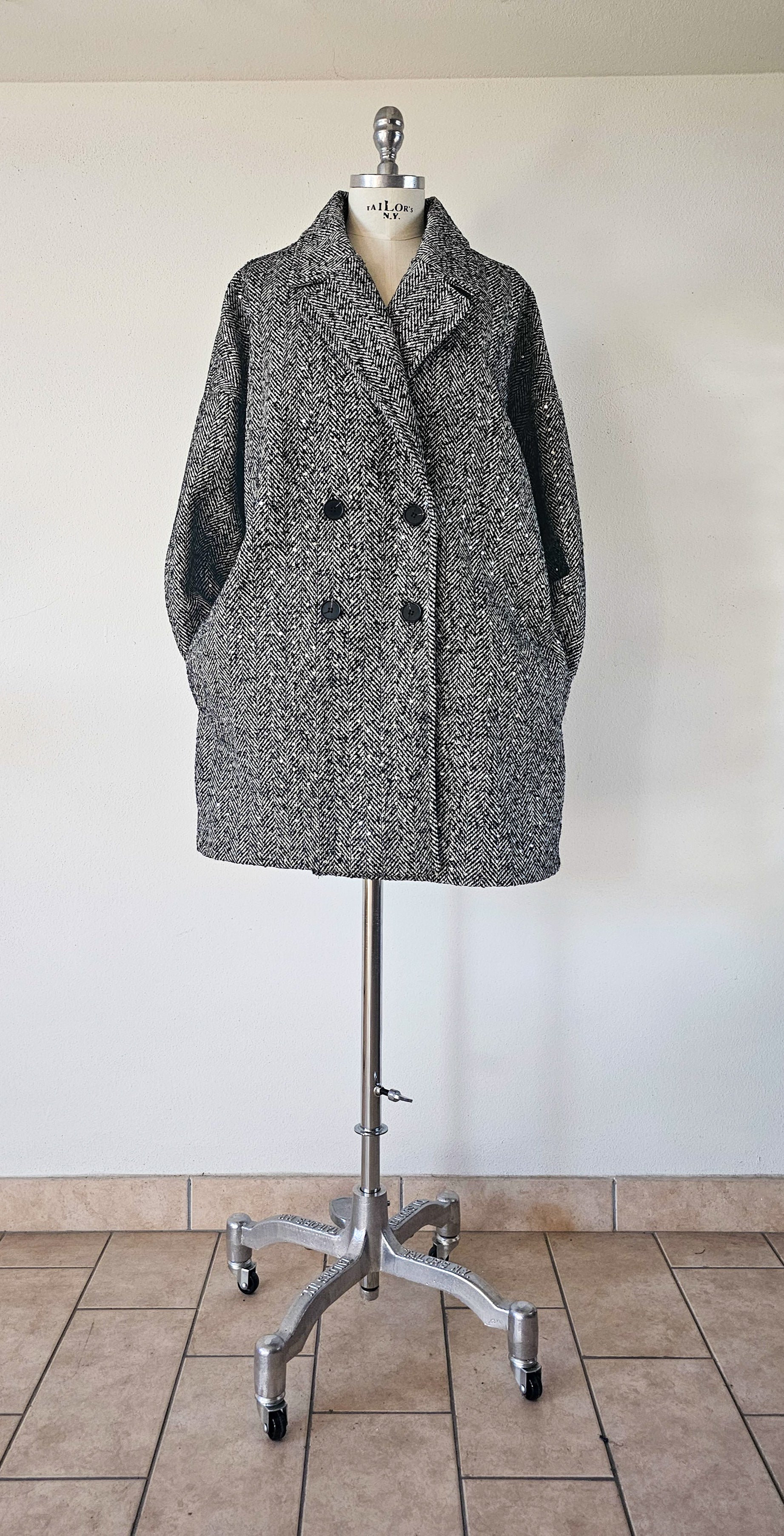 Cappotto oversize in tessuto effetto spinato, impreziosito da micro paillettes integrate nella trama. La struttura è morbida ma ben definita, con linea leggermente a uovo che accompagna il corpo senza costringerlo. Le paillettes diffondono una luce discreta e raffinata, perfetta per valorizzare anche i look più essenziali, dal giorno alla sera.