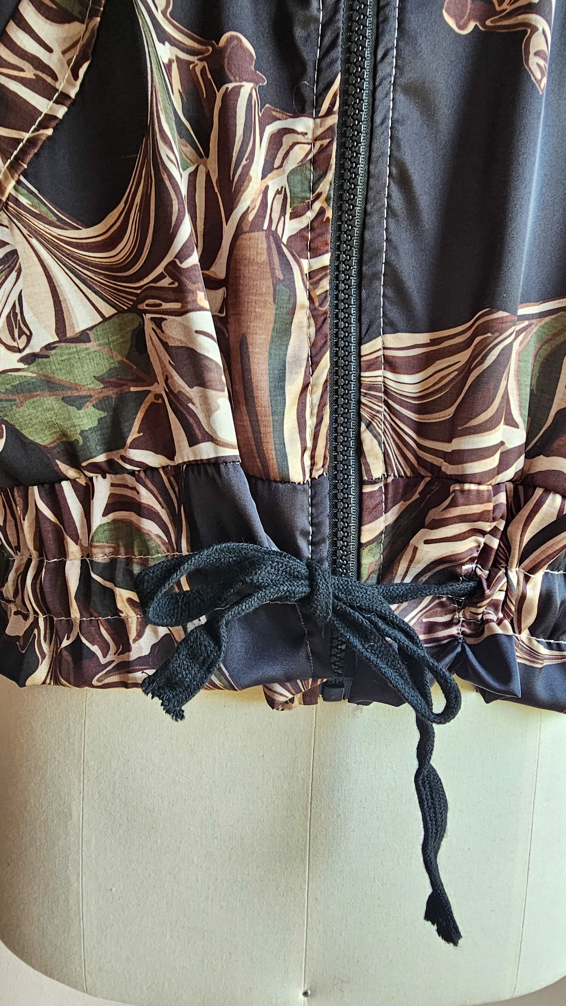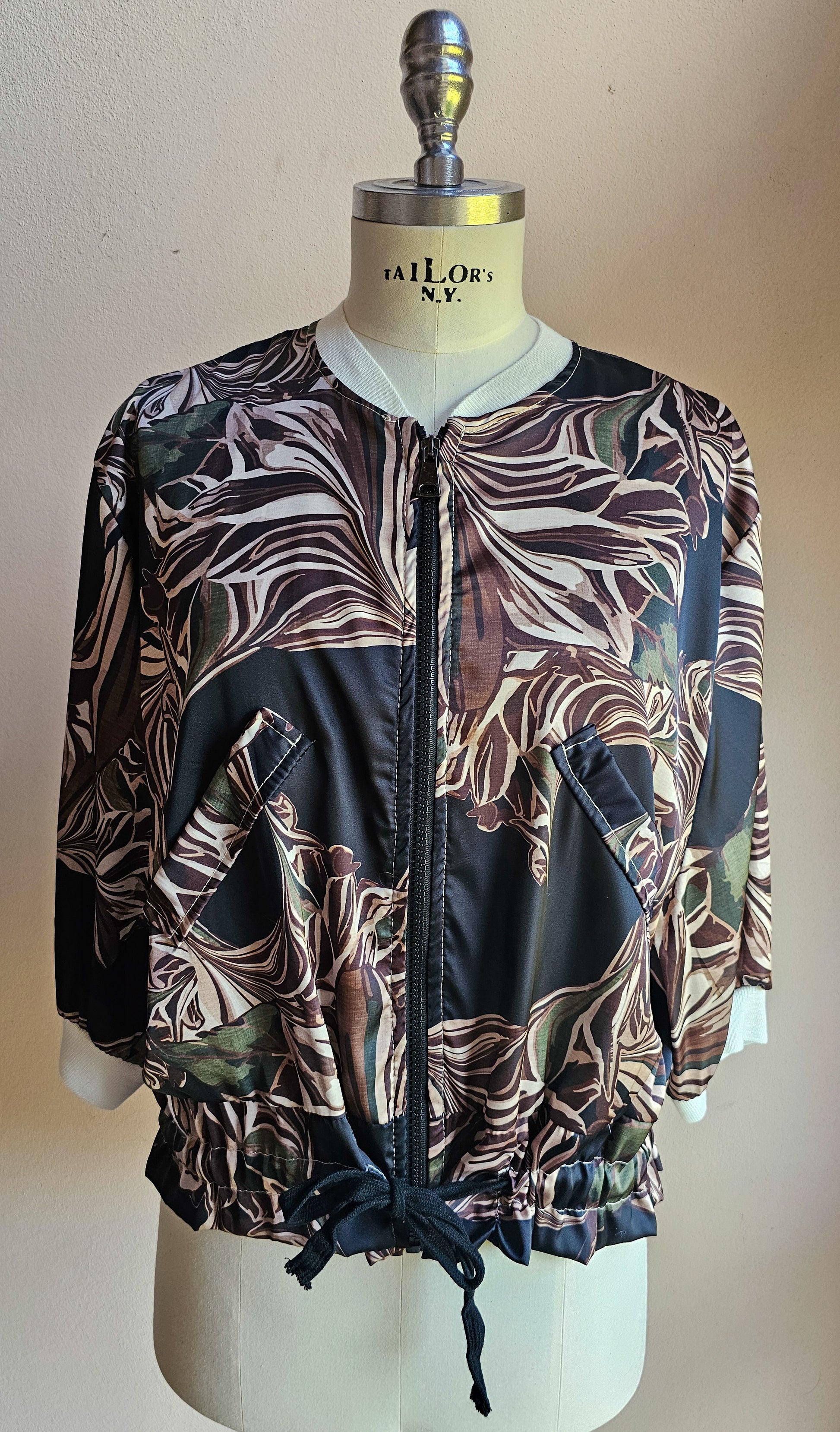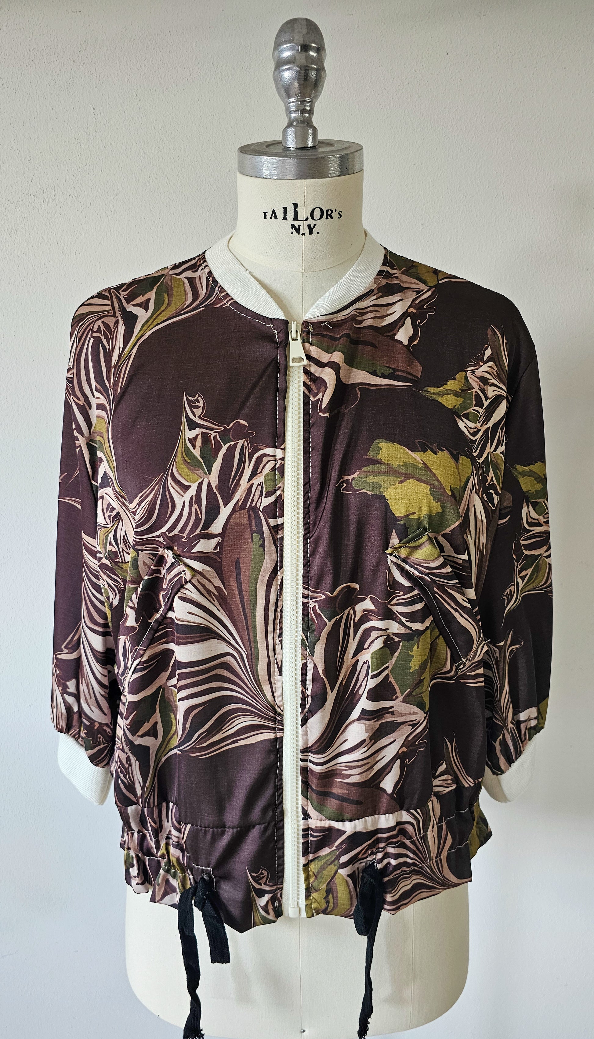 Giacca sottile in microfibra effetto satinato, con linea ispirata al bomber ma senza imbottitura. Collo e polsini in tessuto tipo felpa. Chiusura con zip frontale e doppia coulisse regolabile al fondo.