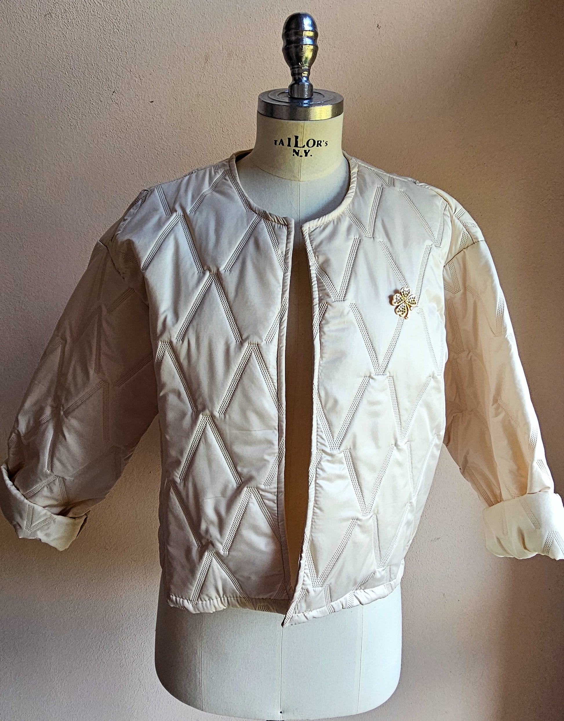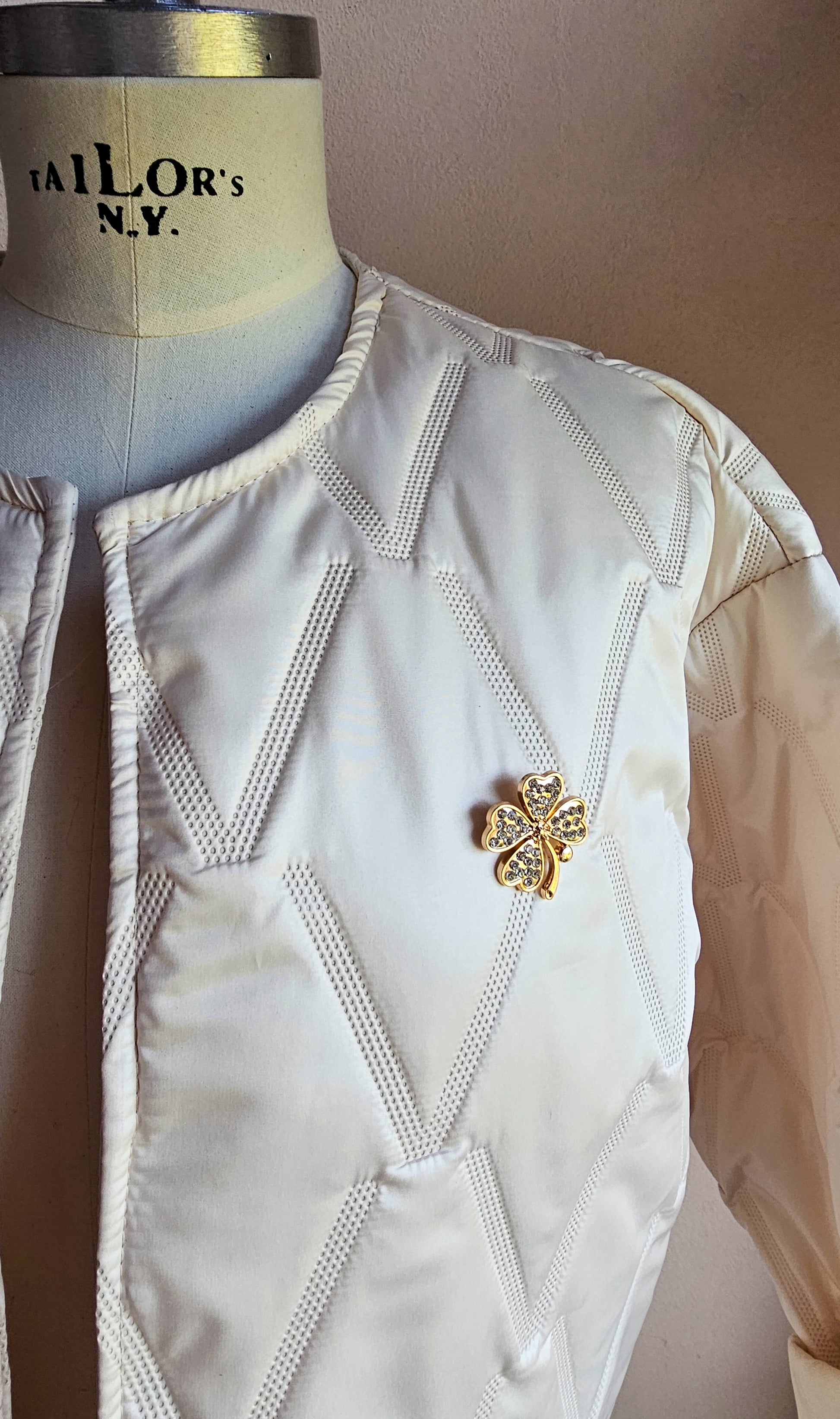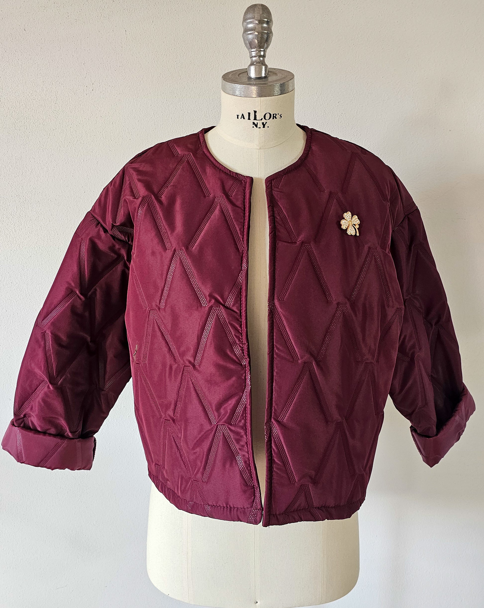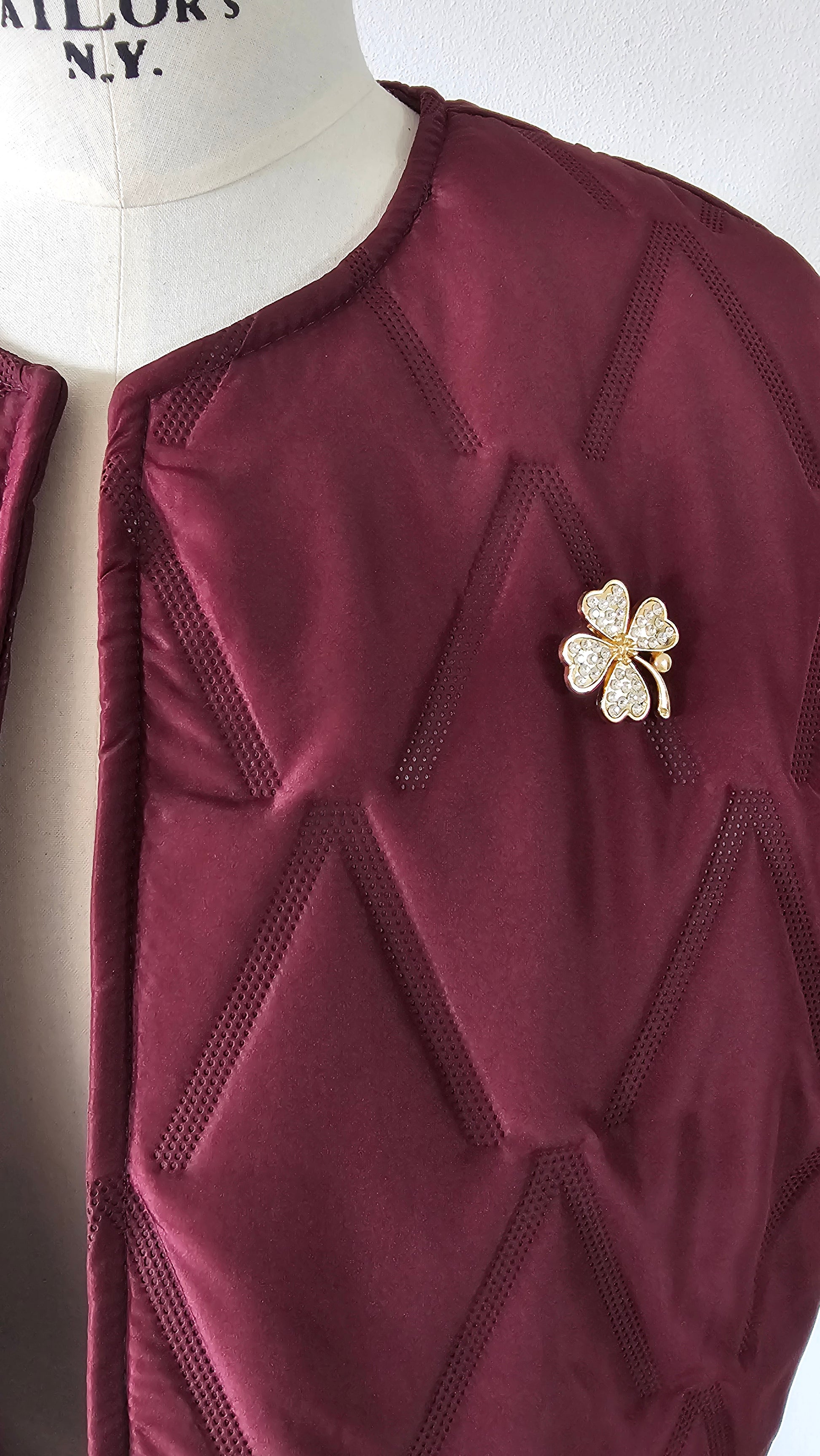 Giacca leggera trapuntata a motivo geometrico, dal taglio corto e linea aperta senza chiusure, spilla gioiello inclusa. Un capo versatile, ideale per look quotidiani o sovrapposizioni. Disponibile in due varianti colore: bordeaux e beige.