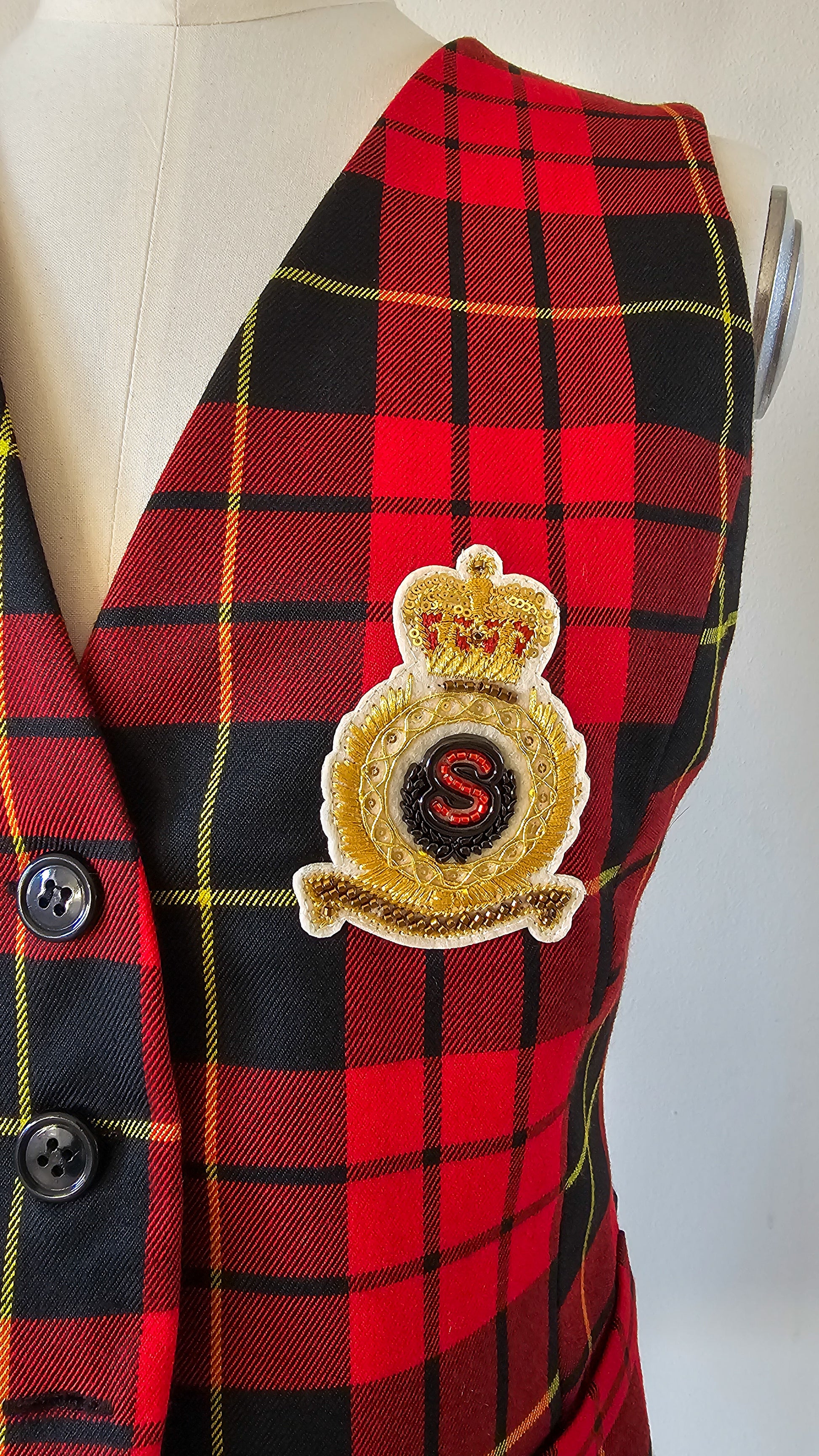 Gilet in tessuto tartan nei toni caldi del rosso, con linea pulita e struttura sartoriale. Il design è valorizzato dalla chiusura frontale con bottoni e da un dettaglio ricamato sul petto, che richiama l’estetica tradizionale in chiave contemporanea. Un capo iconico delle feste, facile da indossare anche spezzato.