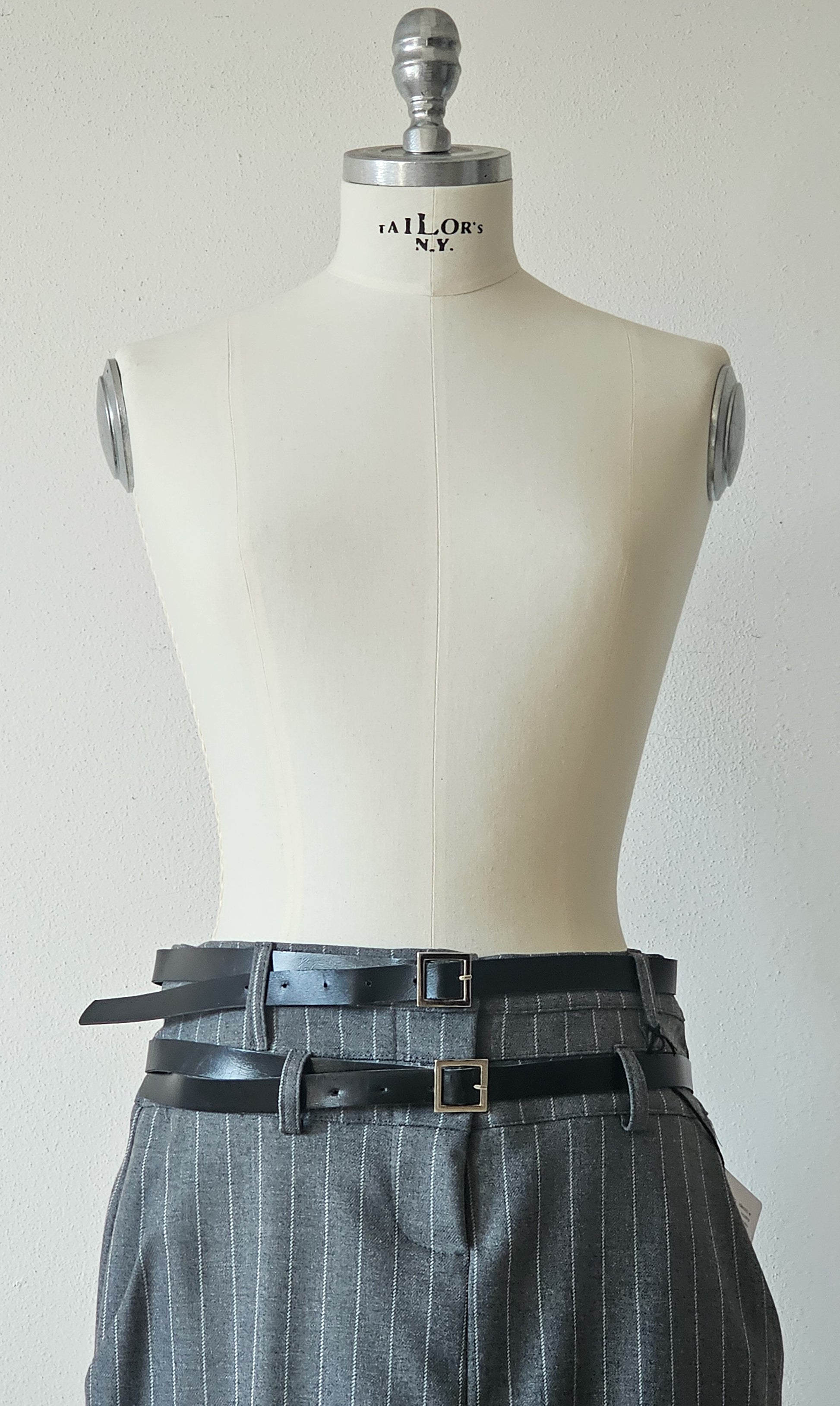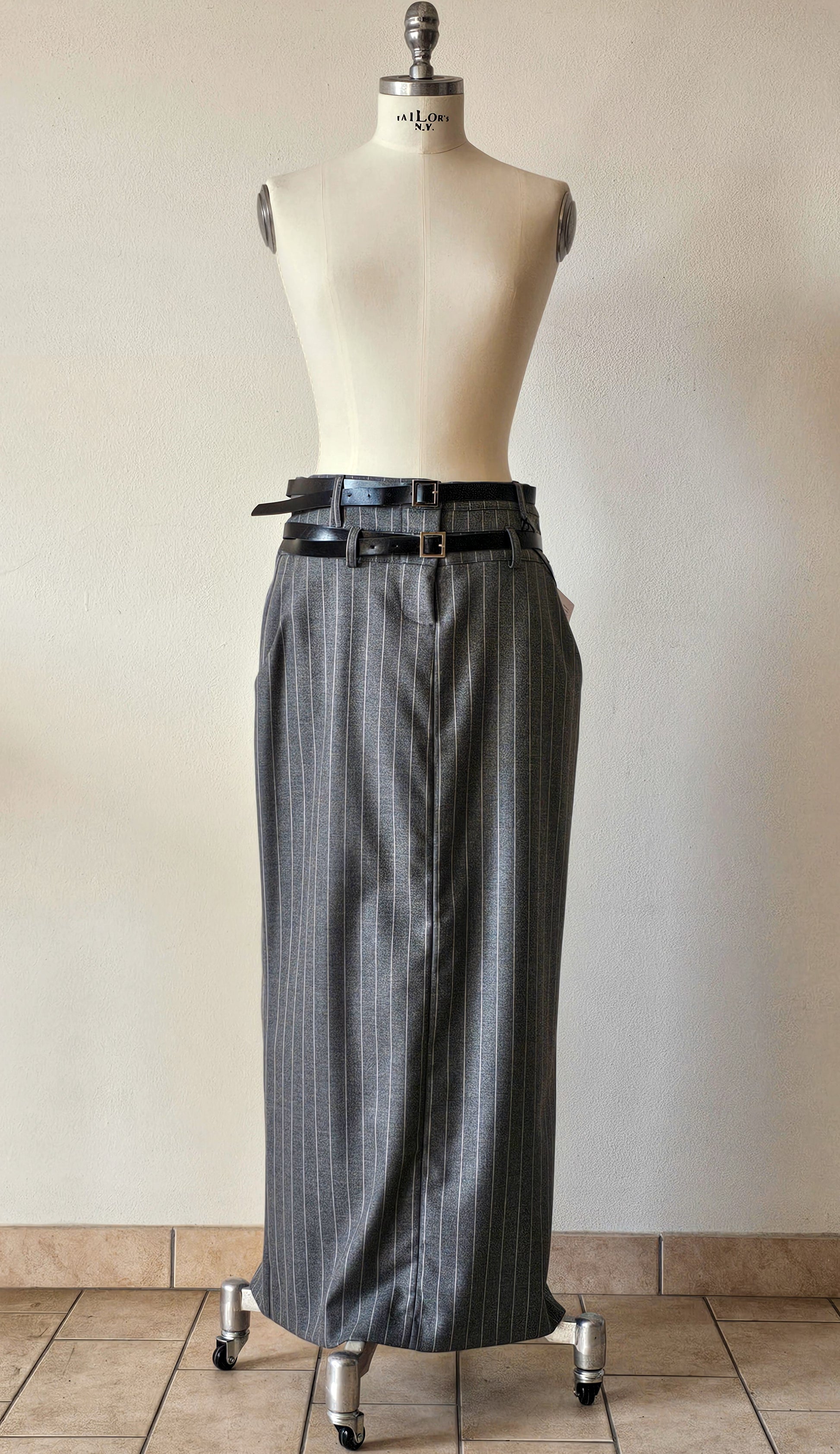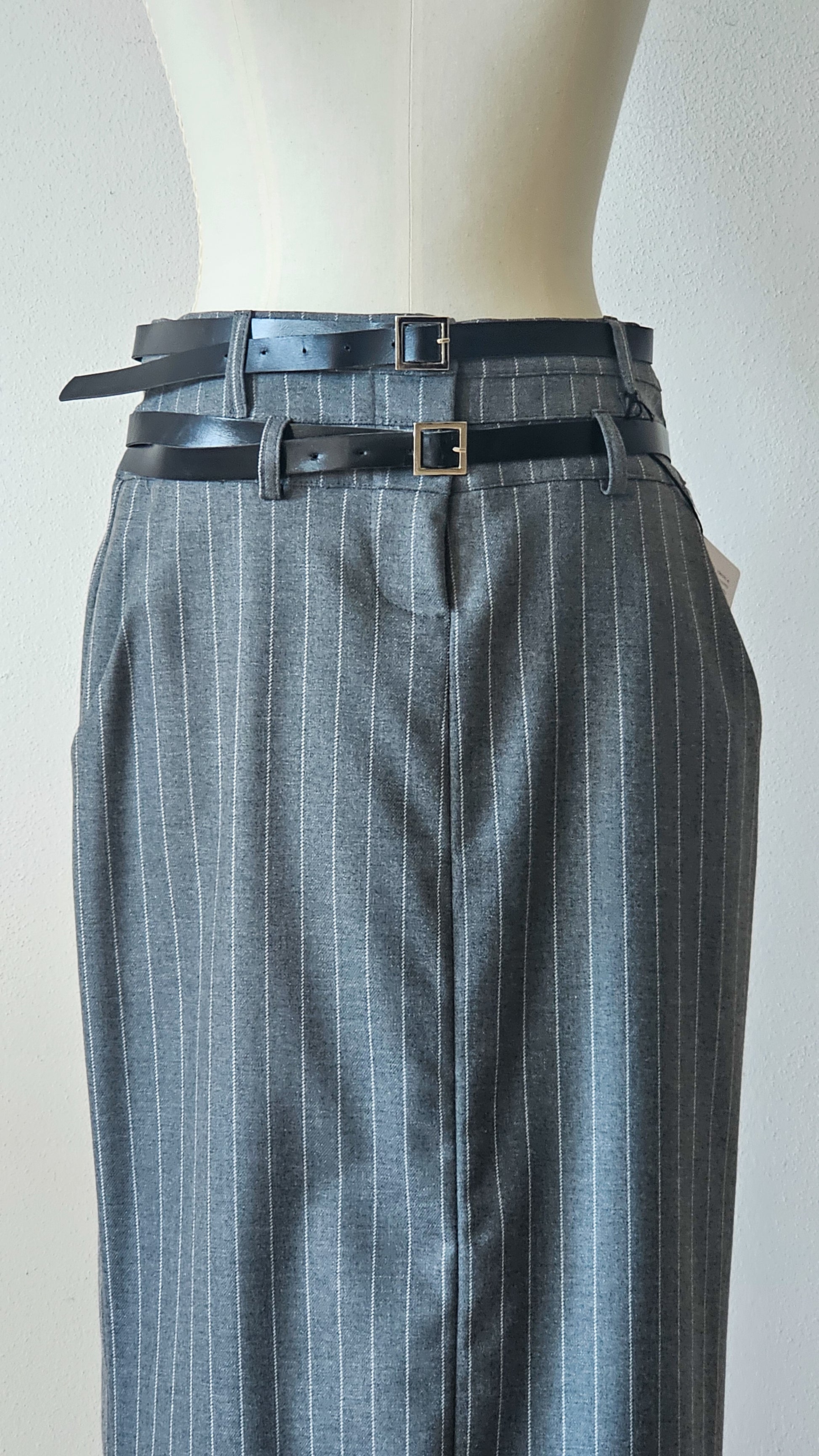 Gonna midi in tessuto gessato con linea a matita, spacco posteriore e cintura sottile in vita. Un classico rivisitato in chiave moderna, dalla vestibilità femminile e strutturata.
