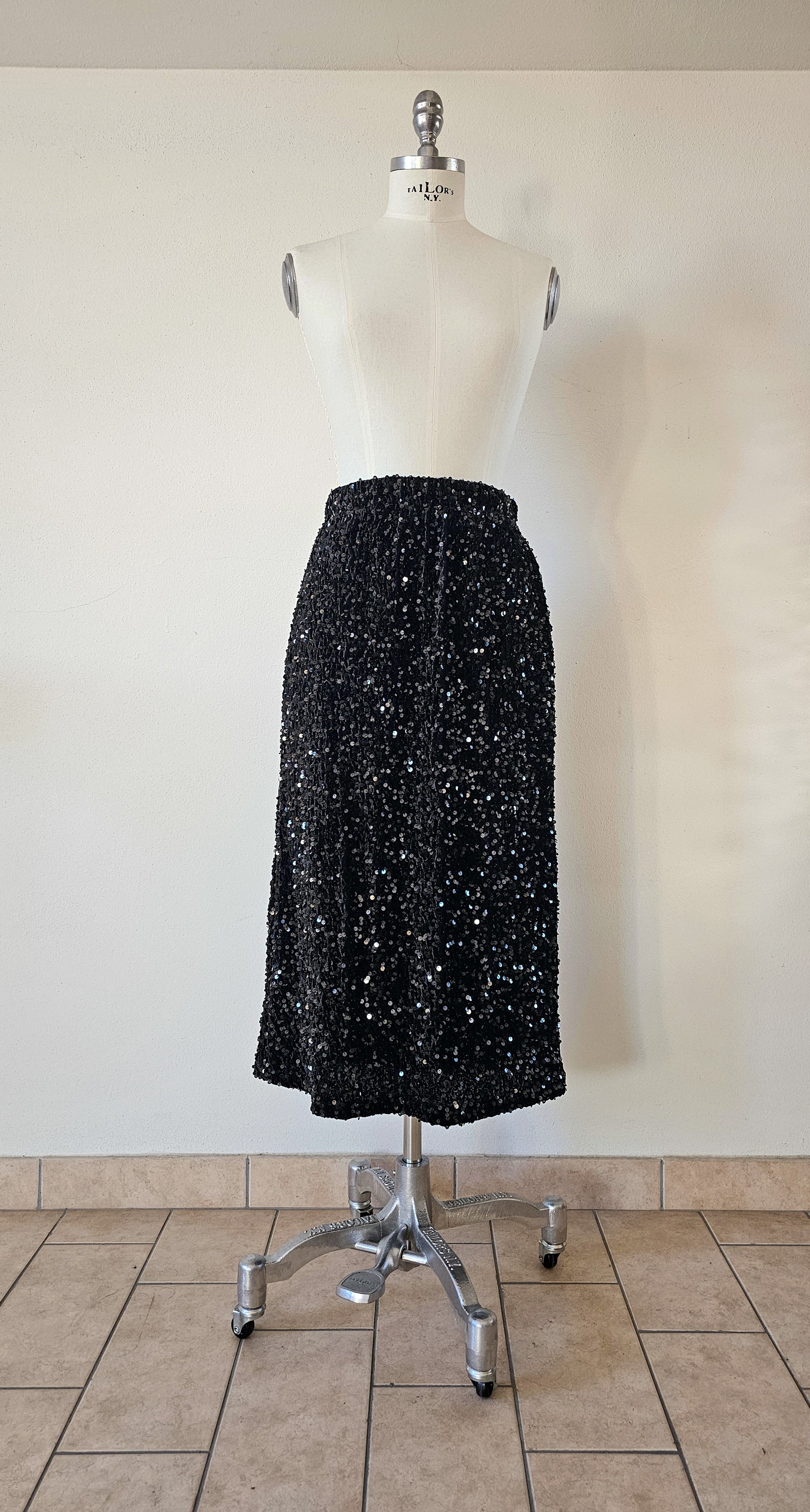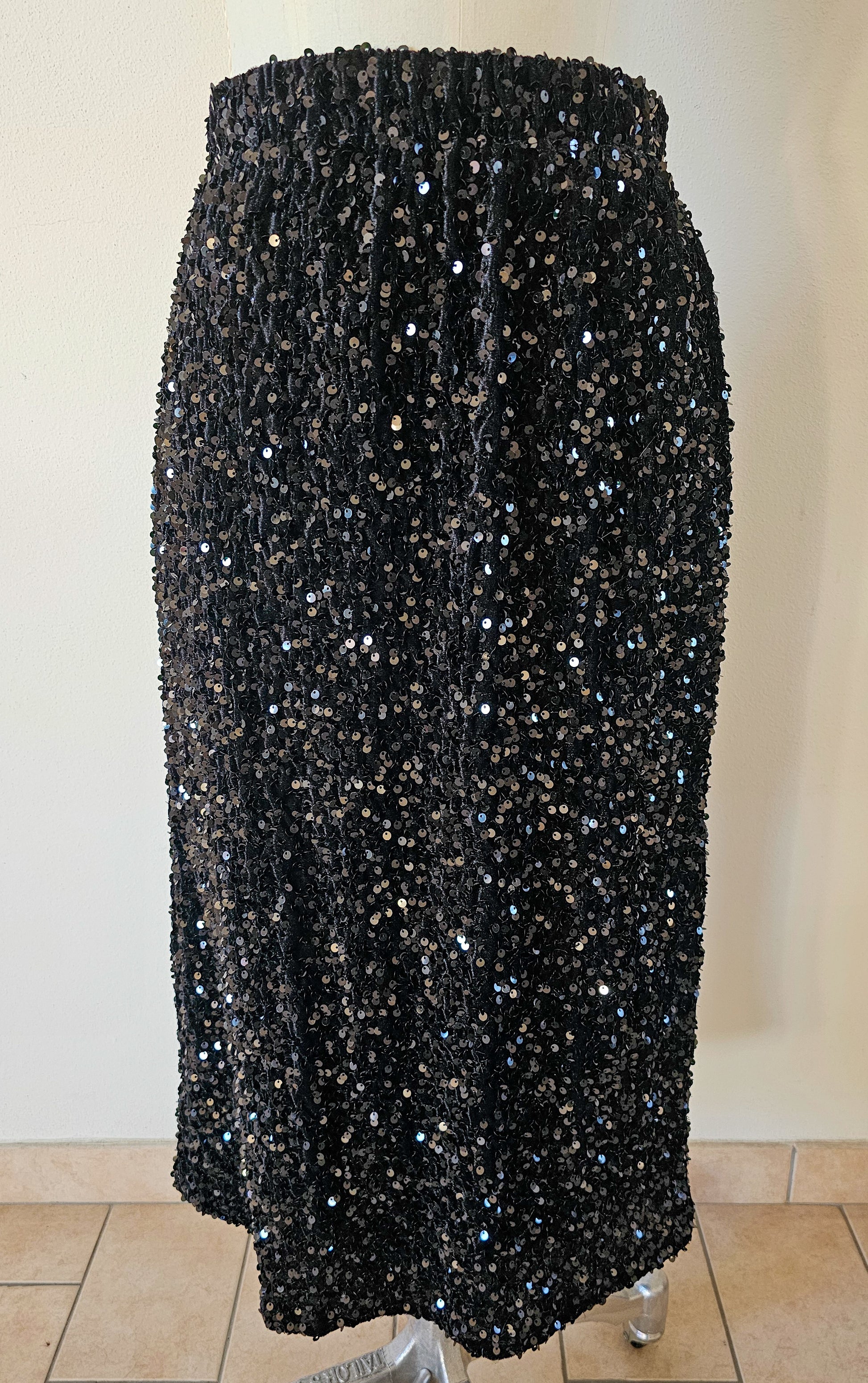 Gonna longuette elasticizzata in ciniglia ricamata di paillettes, dalla linea pulita e luminosa.