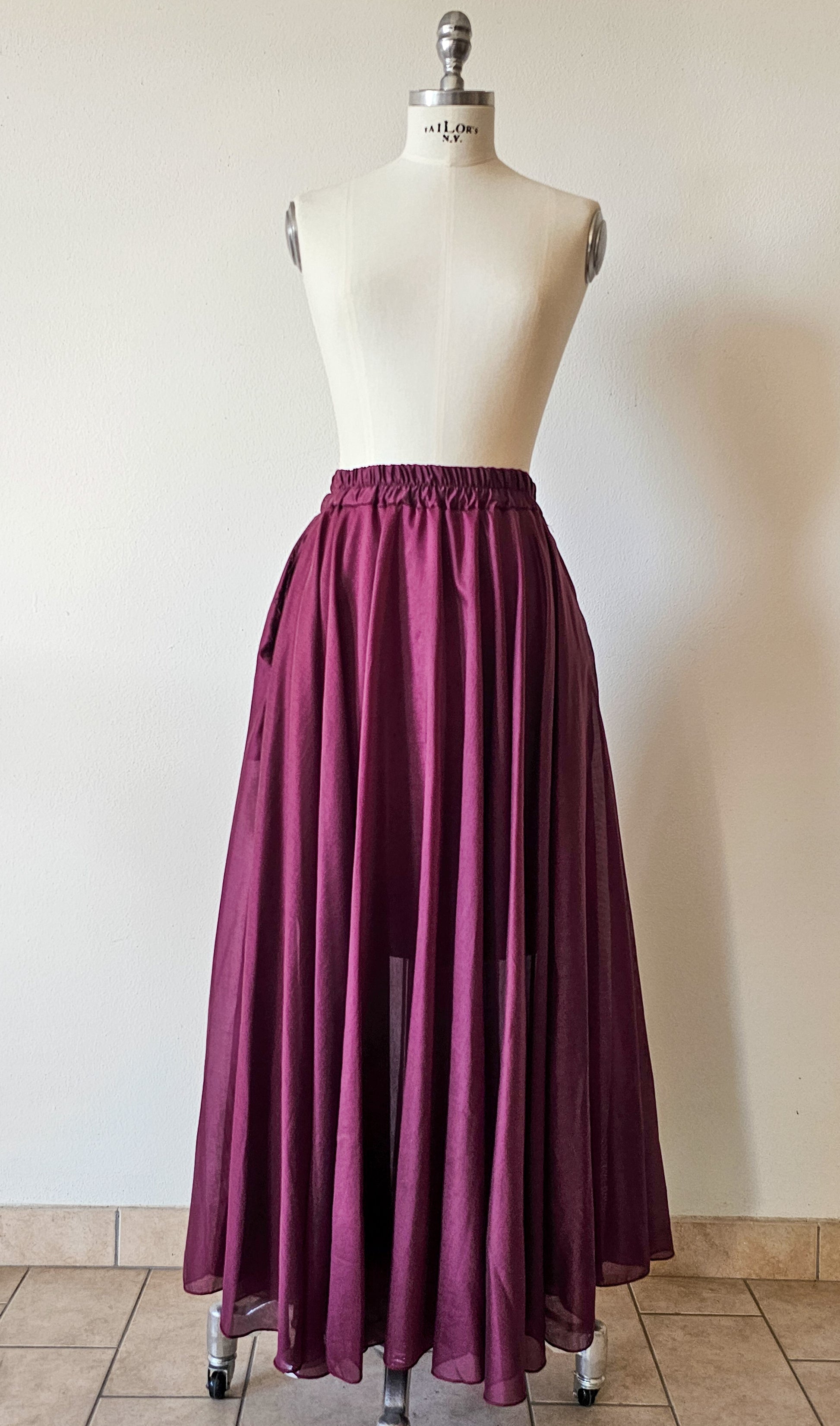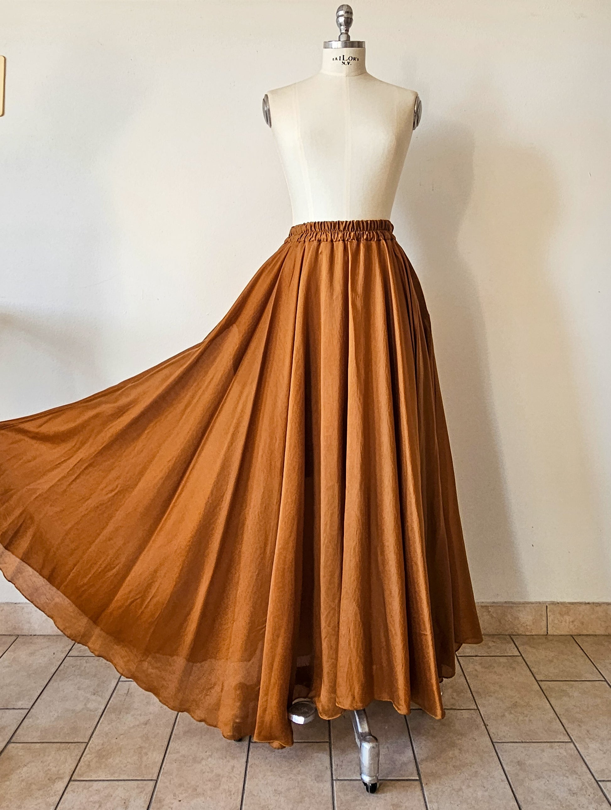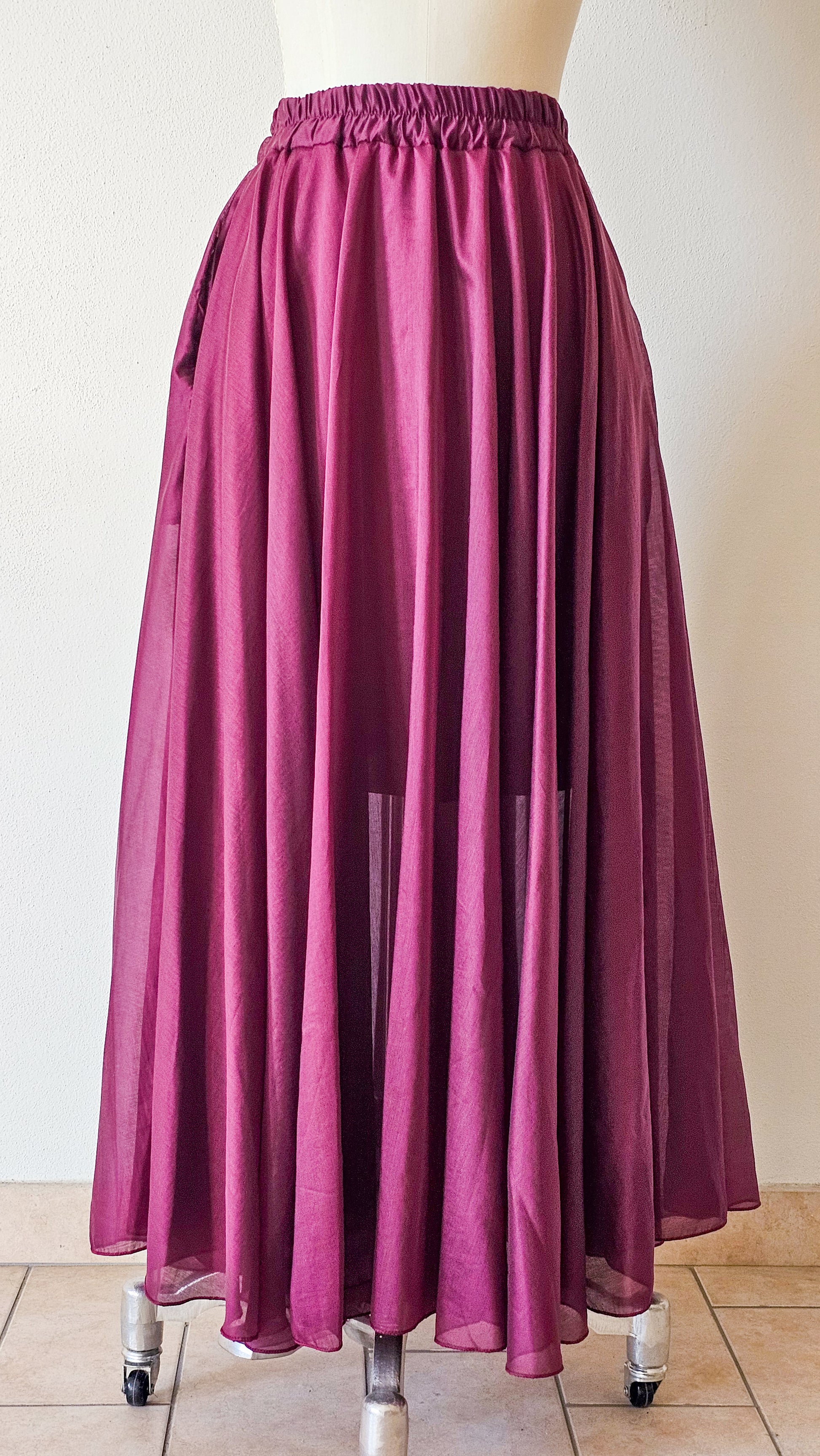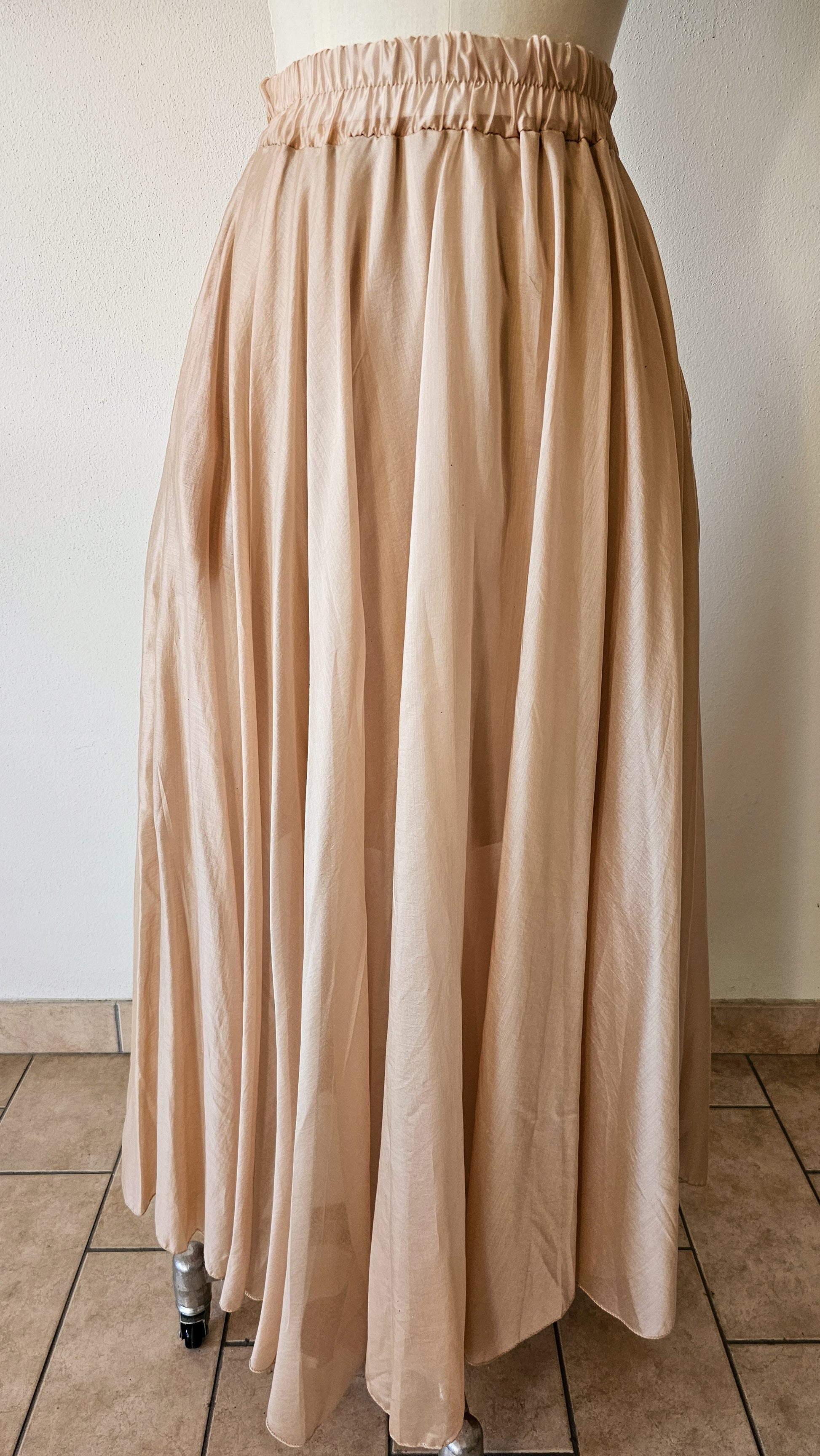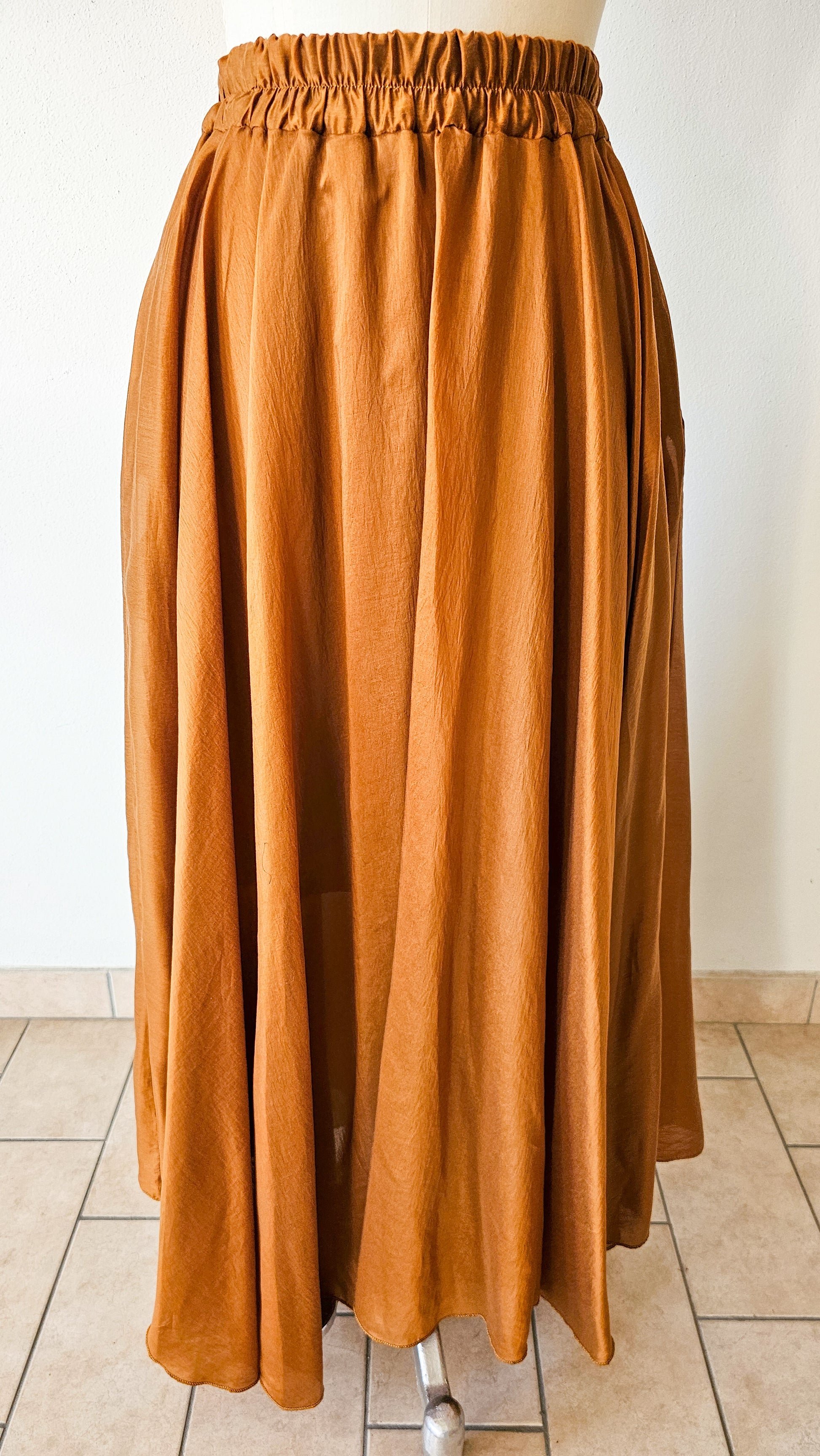 Questa gonna lunga a ruota è realizzata in lyocell satinato, un tessuto morbido, traspirante e piacevole al tatto. La sua linea ampia garantisce una vestibilità fluida e confortevole, mentre l’elastico in vita assicura praticità e adattabilità.