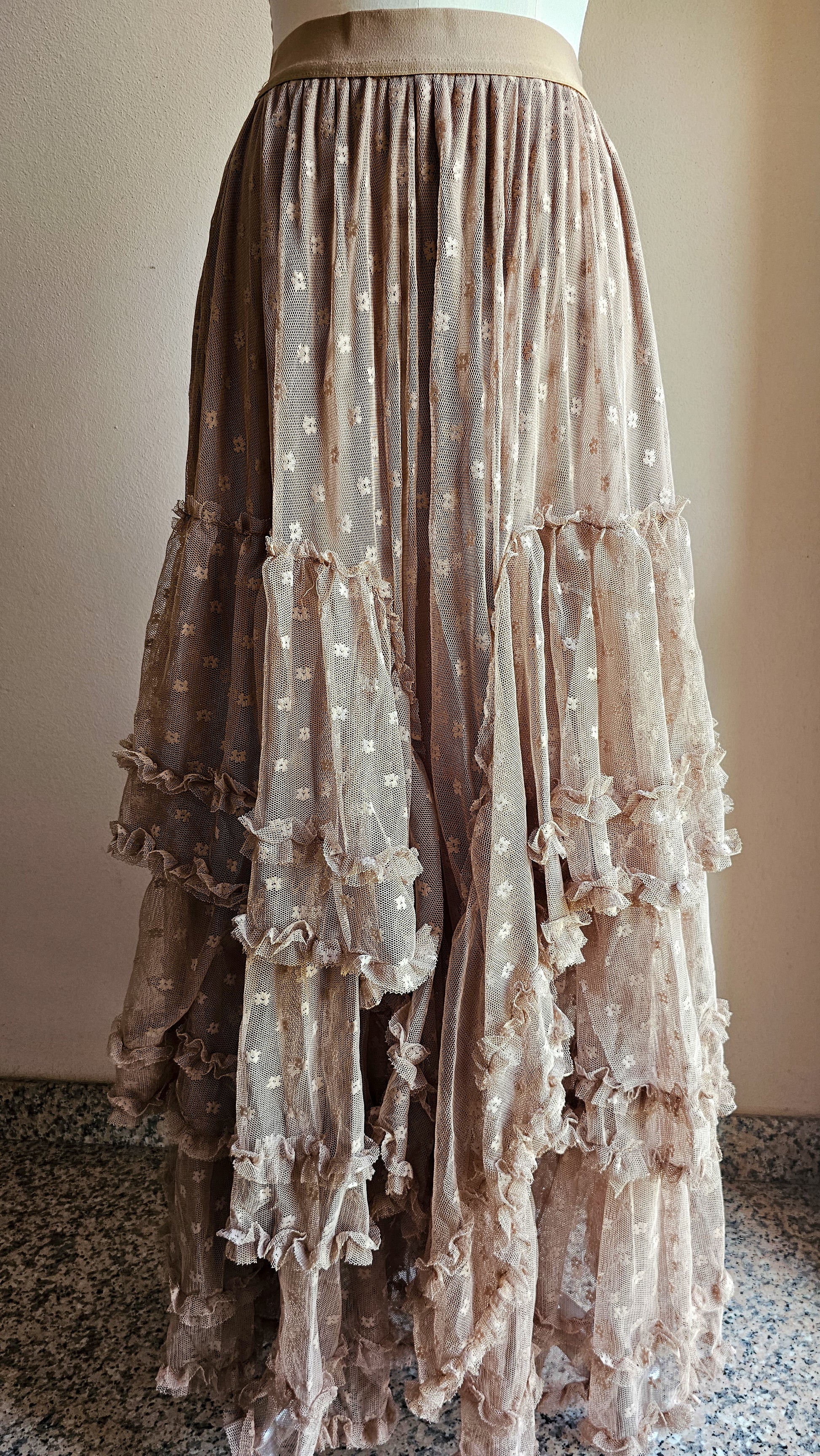 Gonna lunga realizzata in pizzo color beige, con costruzione a balze che dona volume e movimento. Vita elasticizzata per un’ottima adattabilità. Sottogonna in tinta integrato. Taglia unica.
