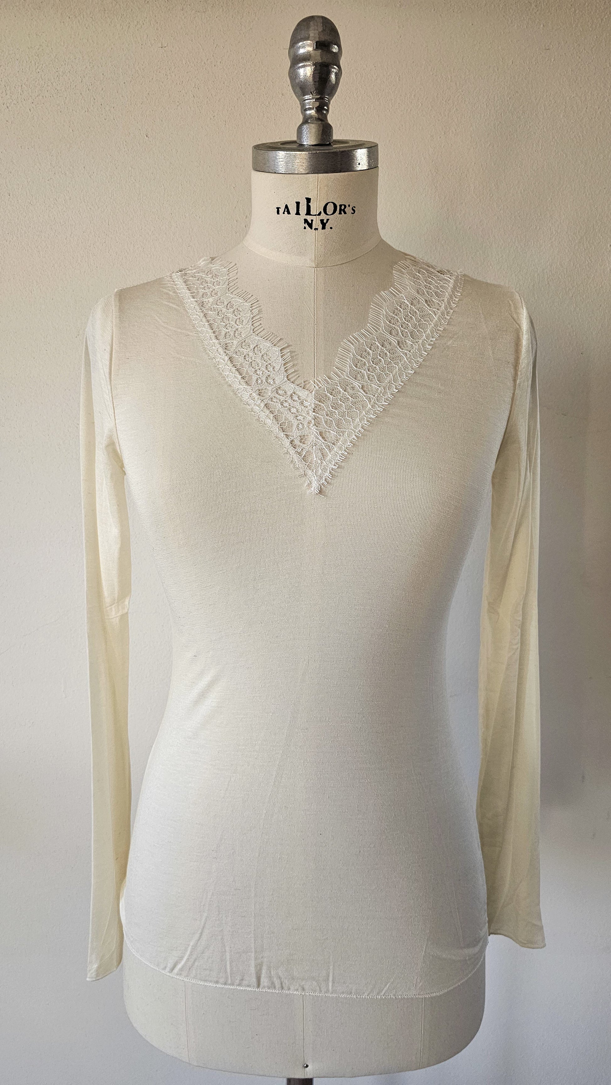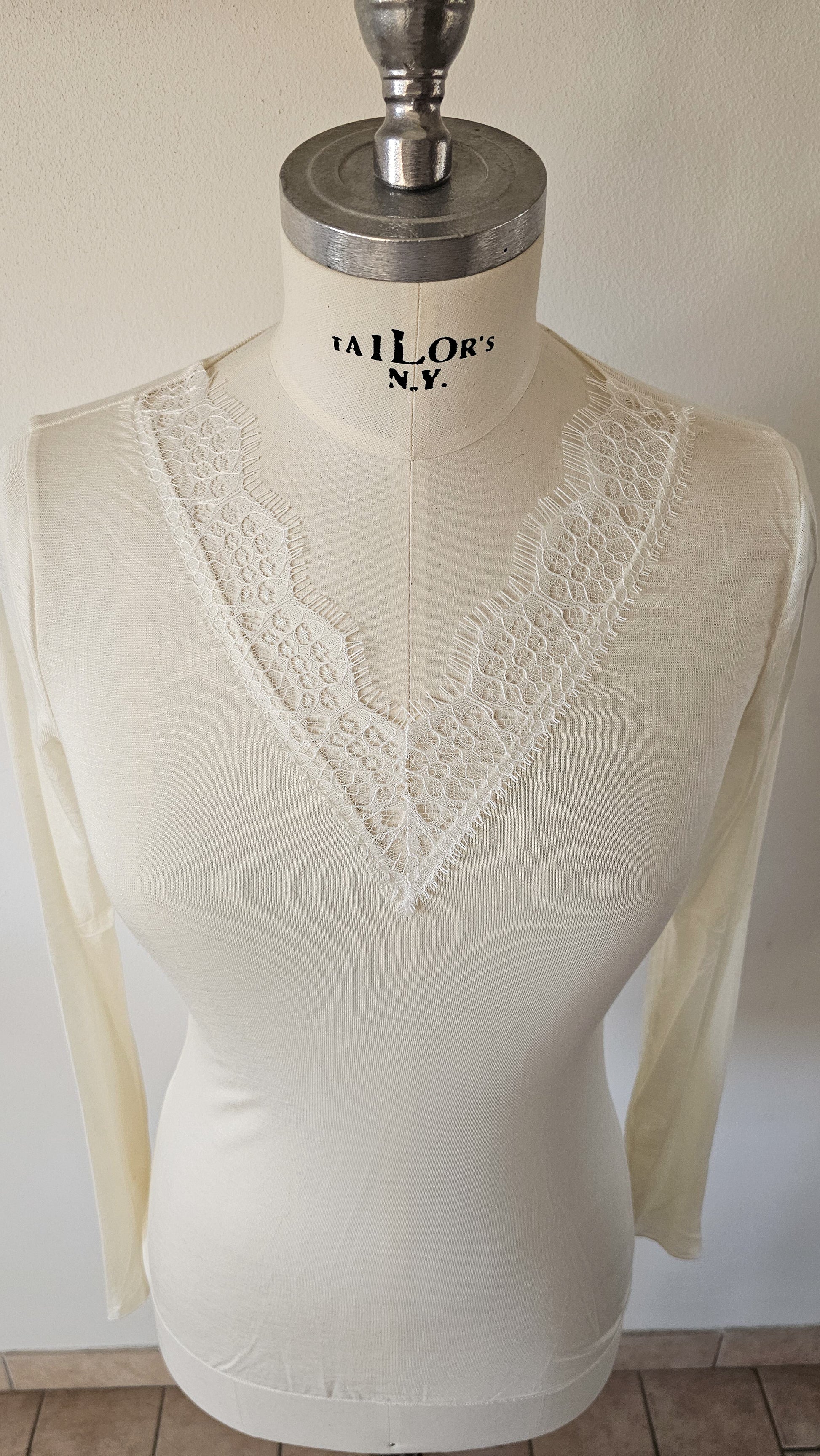Maglia sottile e femminile in misto cachemire elasticizzato, caratterizzata dallo scollo a V impreziosito da un delicato bordo in pizzo tono su tono.
