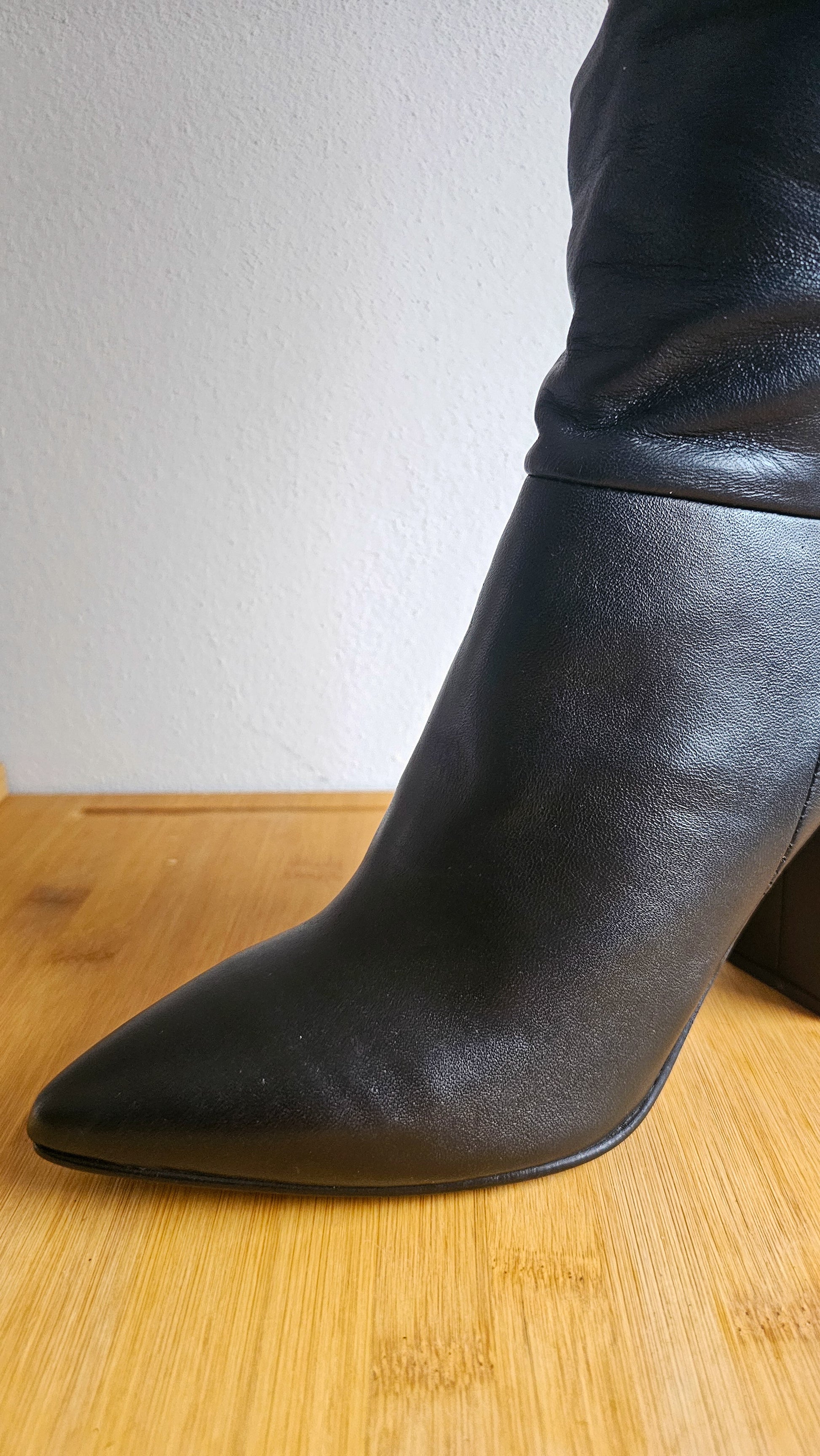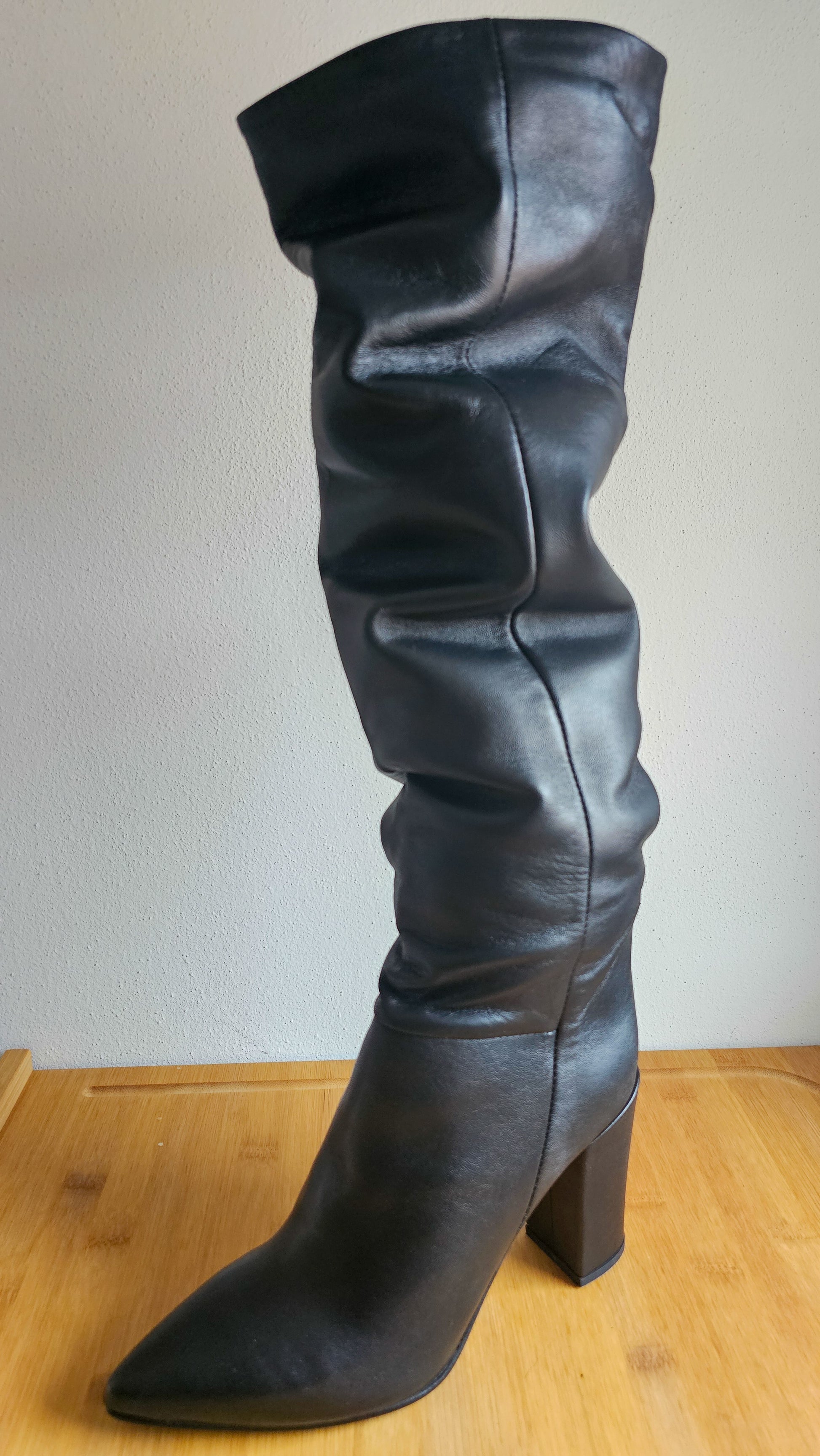 Stivale al ginocchio in vera pelle morbidissima, pensato per essere indossato sia tirato su che arricciato lungo la gamba, grazie alla struttura morbida e modellabile. La punta affusolata slancia, mentre il tacco largo garantisce stabilità e comfort anche per l’uso quotidiano. Un modello versatile e moderno, perfetto con gonne, mini, leggings e denim.